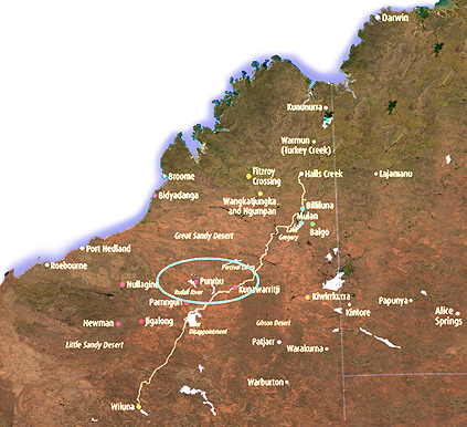 Punmu is located 311kms east of Nullagine and 397kms south of Bidyadanga. The nearest service town is Port Hedland, which is 600km away. The main track runs between Telfer Mine Road and Wapet Road. Lat. 22 02 38.92S Long. 123 07 16.74E